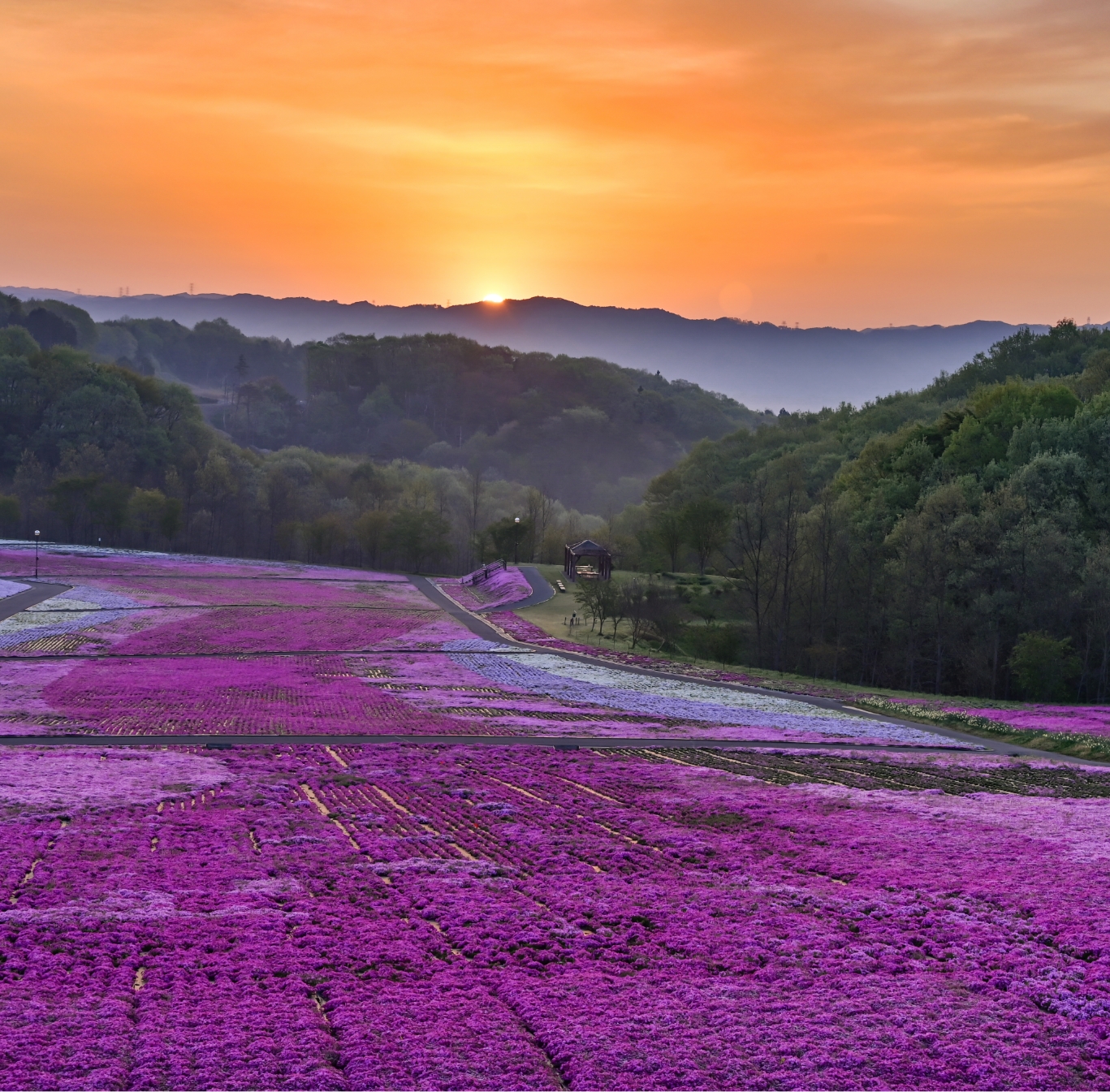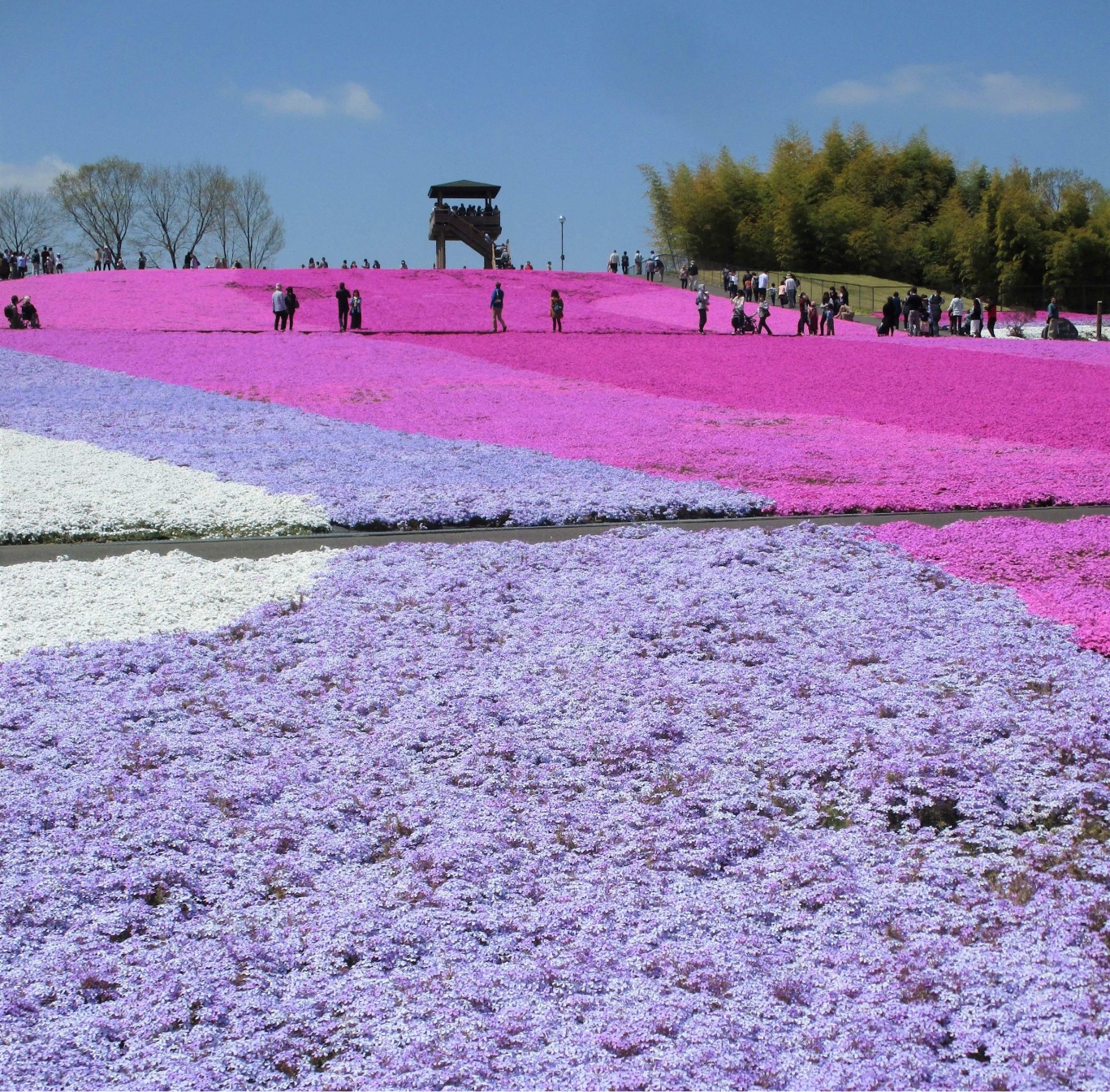本州有数の広さ18,000㎡の面積に赤・ピンク・紫・白の4色の芝ざくら約28万株が植栽されています。