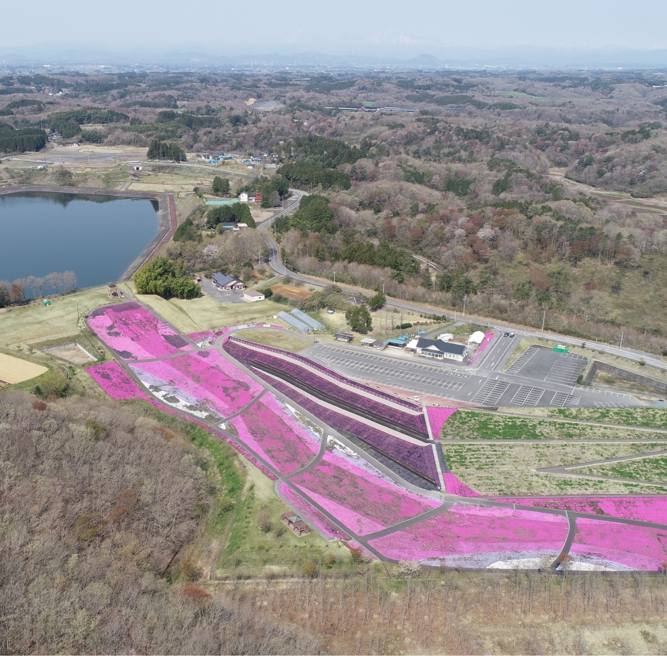 芝ざくらはこの地域を源流とする”小貝川”の流れをイメージして植栽されており、毎年4月上旬から4月末くらいまで4色の芝ざくらが一面を飾り、展望台から見渡すパッチワークの光景が美しい公園です。また、芝ざくら公園西側には「芳賀台地」に安定的な農業用水を確保するために造成された『外周:1.400m、総貯水量:1,580千㎥、満水面積:117,000㎡』芳那の水晶湖(塩田調整池)があり、芝ざくら公園・水晶湖公園として豊かな自然が楽しめるエリアとなっています。